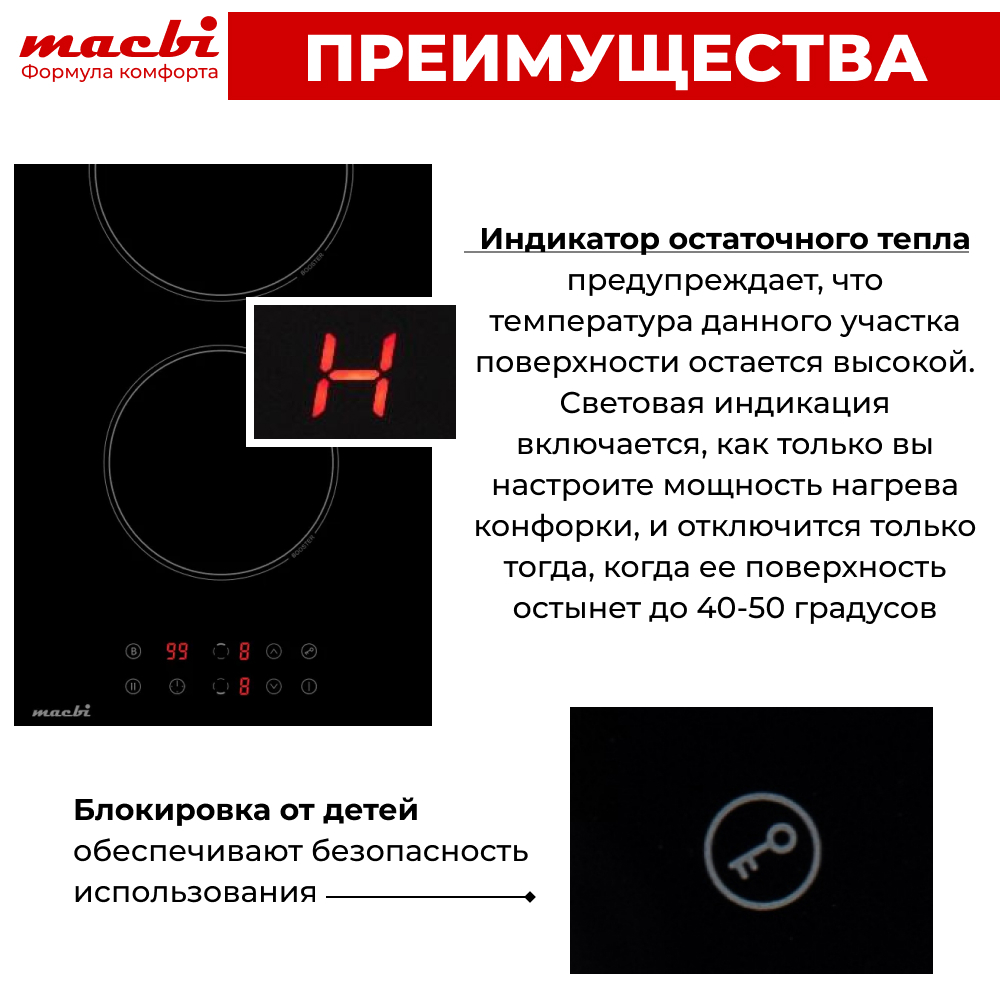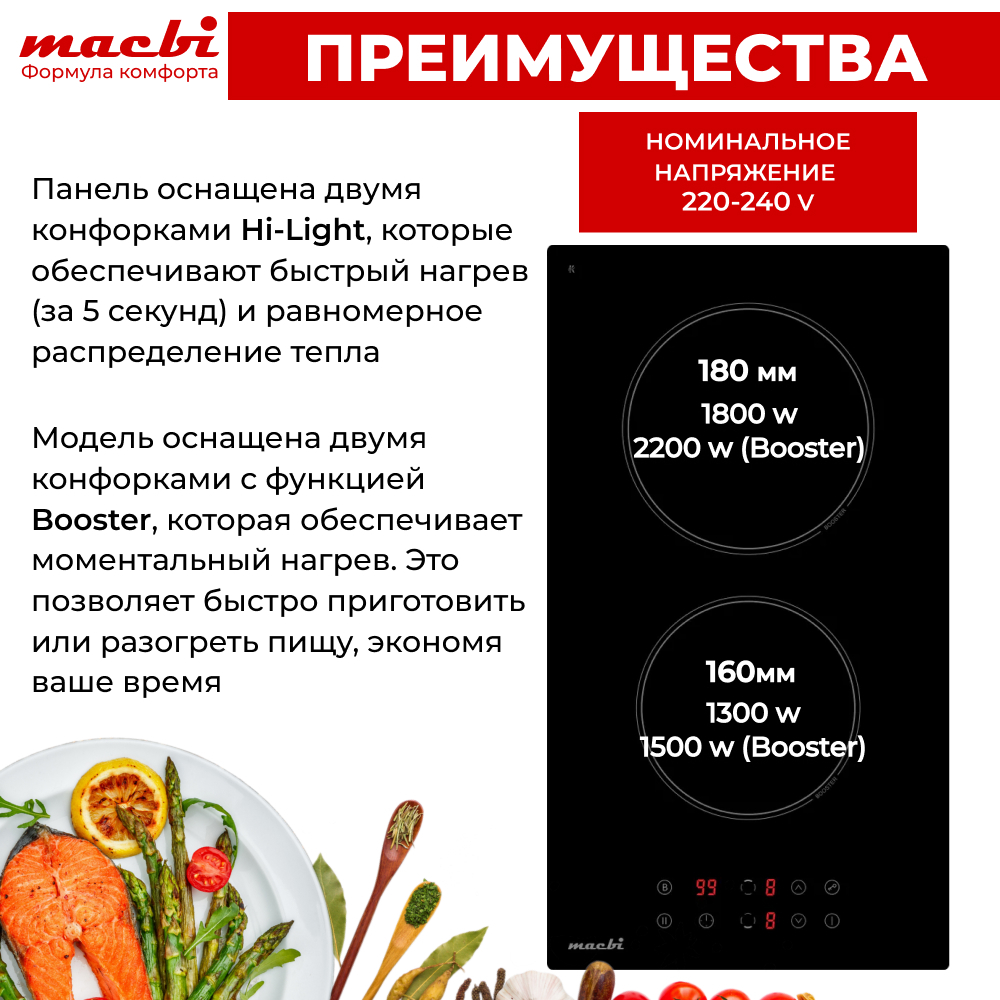 Индукционная варочная панель MACBI GK-ID303610EB-P (формат «Домино») — это идеальное решение для тех, кто ценит скорость, безопасность и современный дизайн, но ограничен в пространстве.