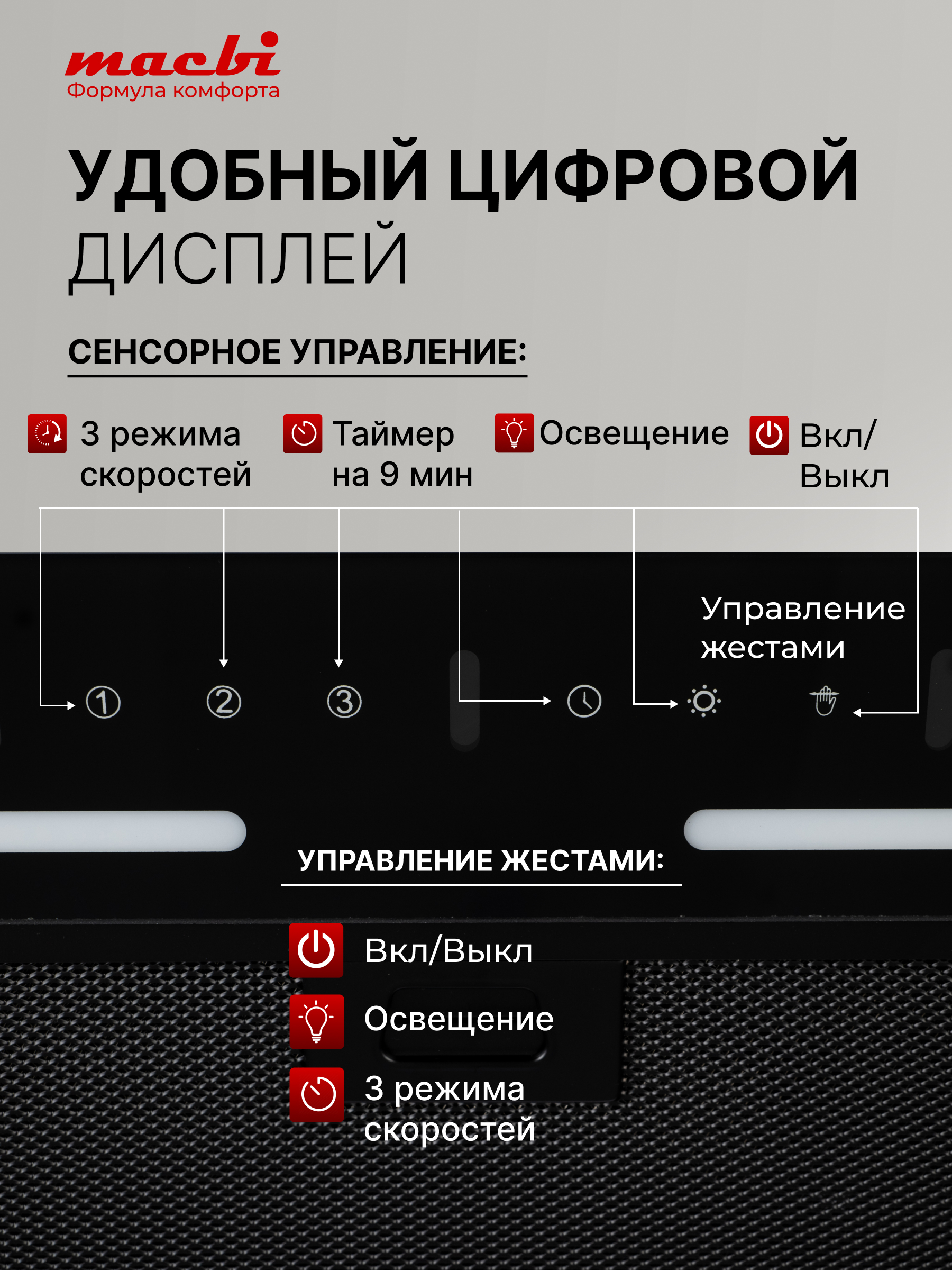 Сенсорный блок управления скоростью и освещением позволяет легко контролировать работу устройства, а функция управления жестами обеспечивает дополнительное удобство — просто проведите рукой вперед, и вытяжка заработает!