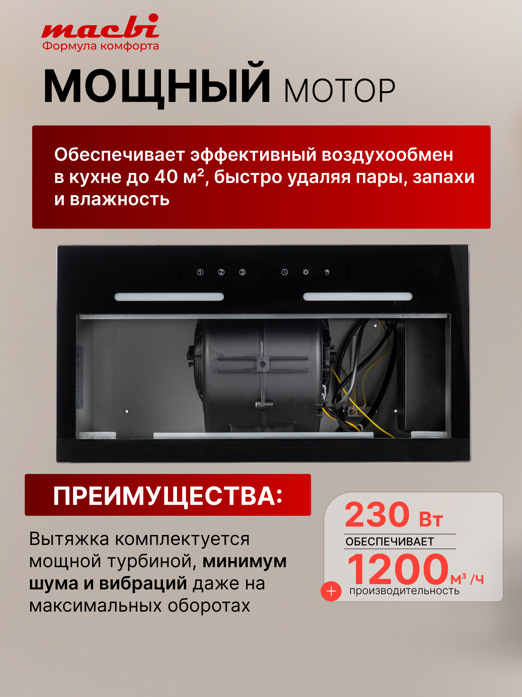 С мощностью 1200 м³/ч, вытяжка легко справляется с любыми ароматами и дымом, создавая идеальные условия для приготовления пищи.