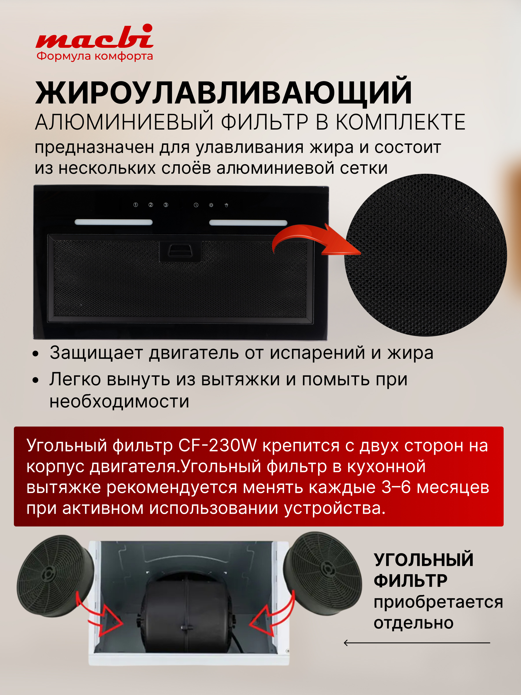 Угольный фильтр CF-230W гарантирует эффективный захват жира и запахов (приобретается отдельно, по необходимости).