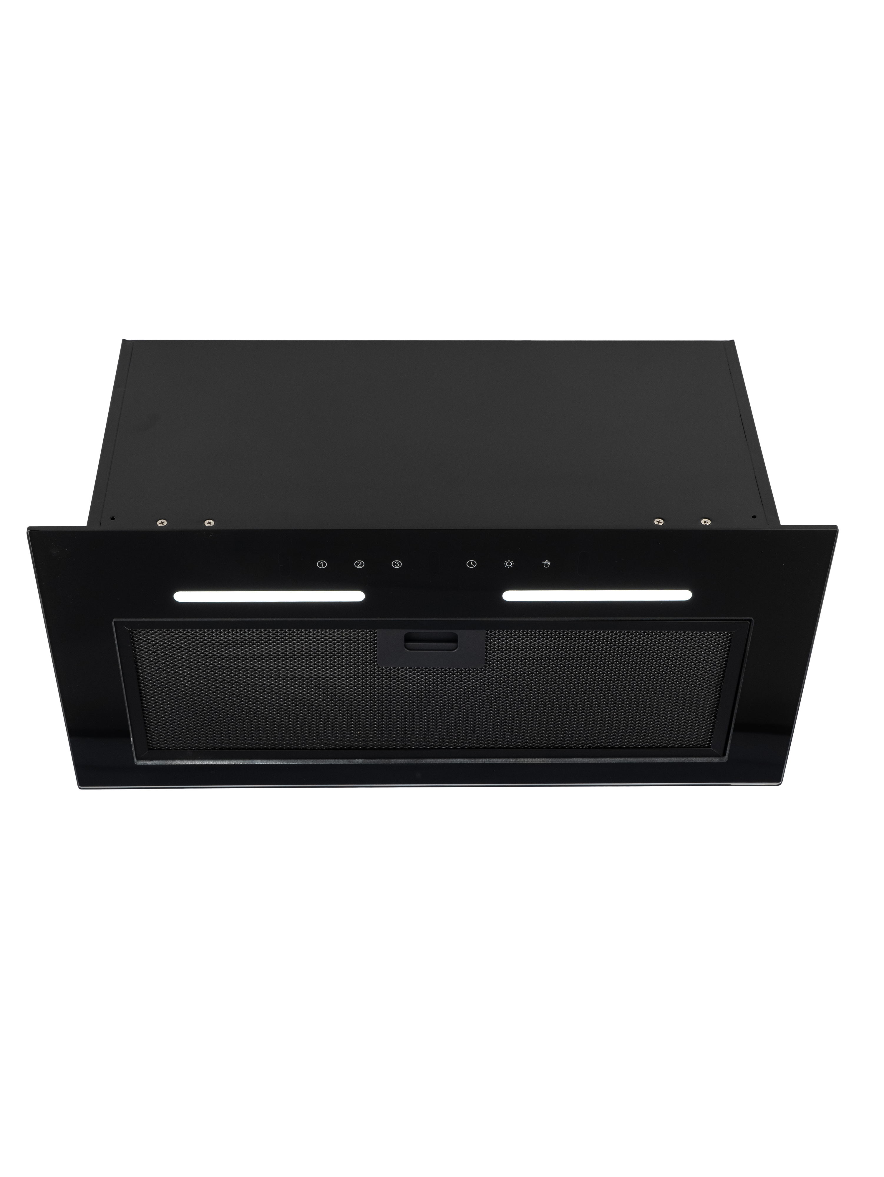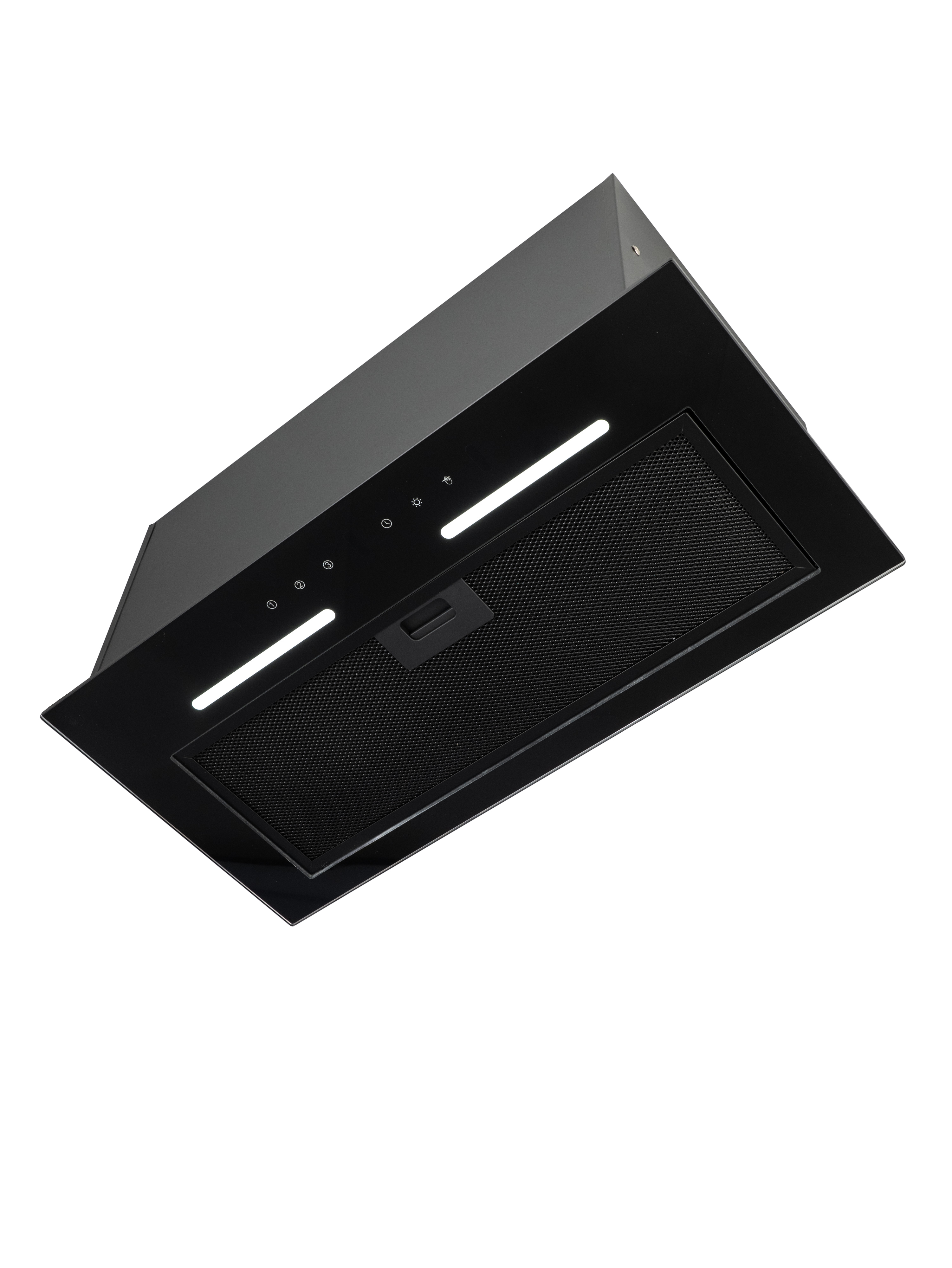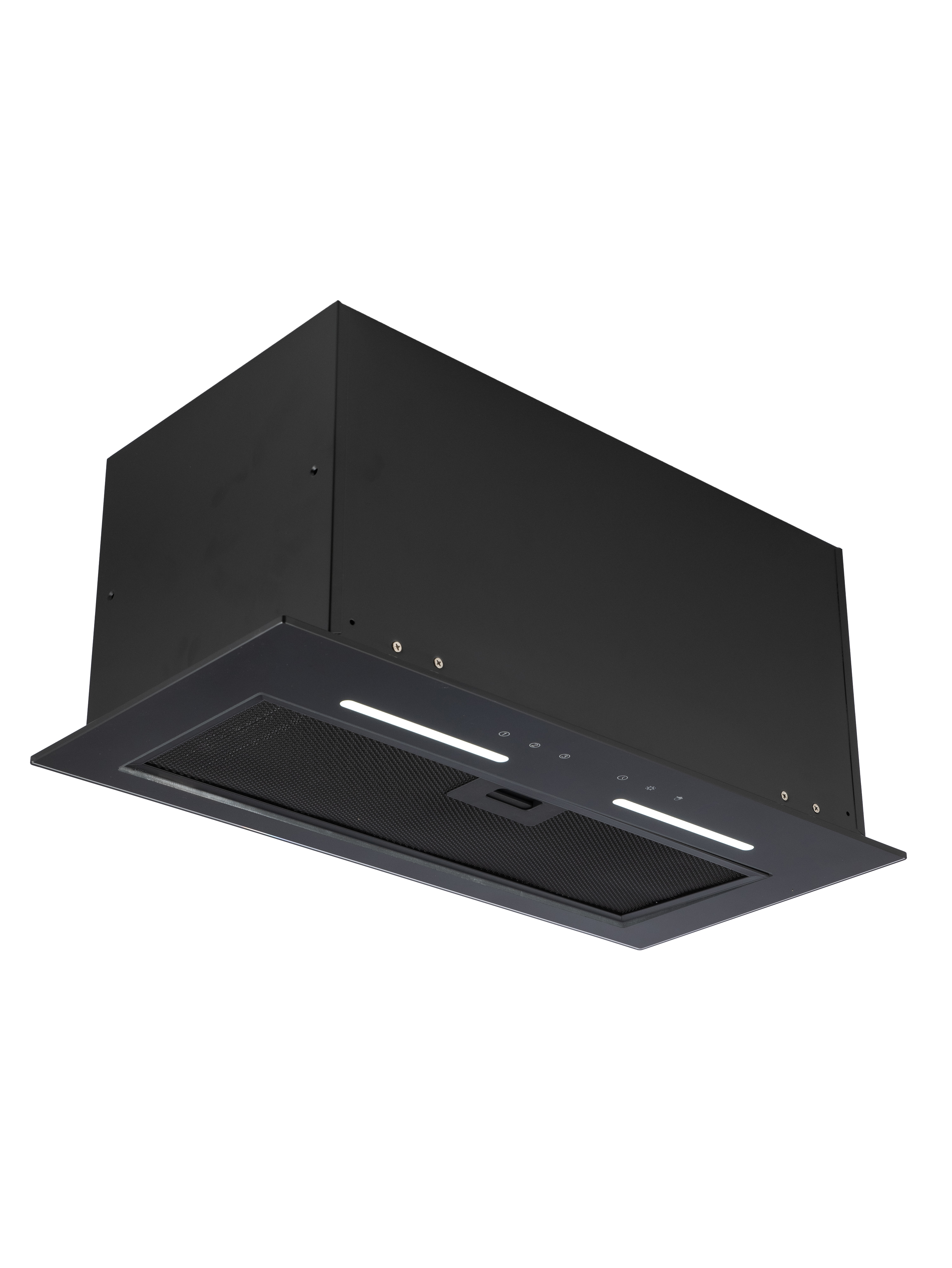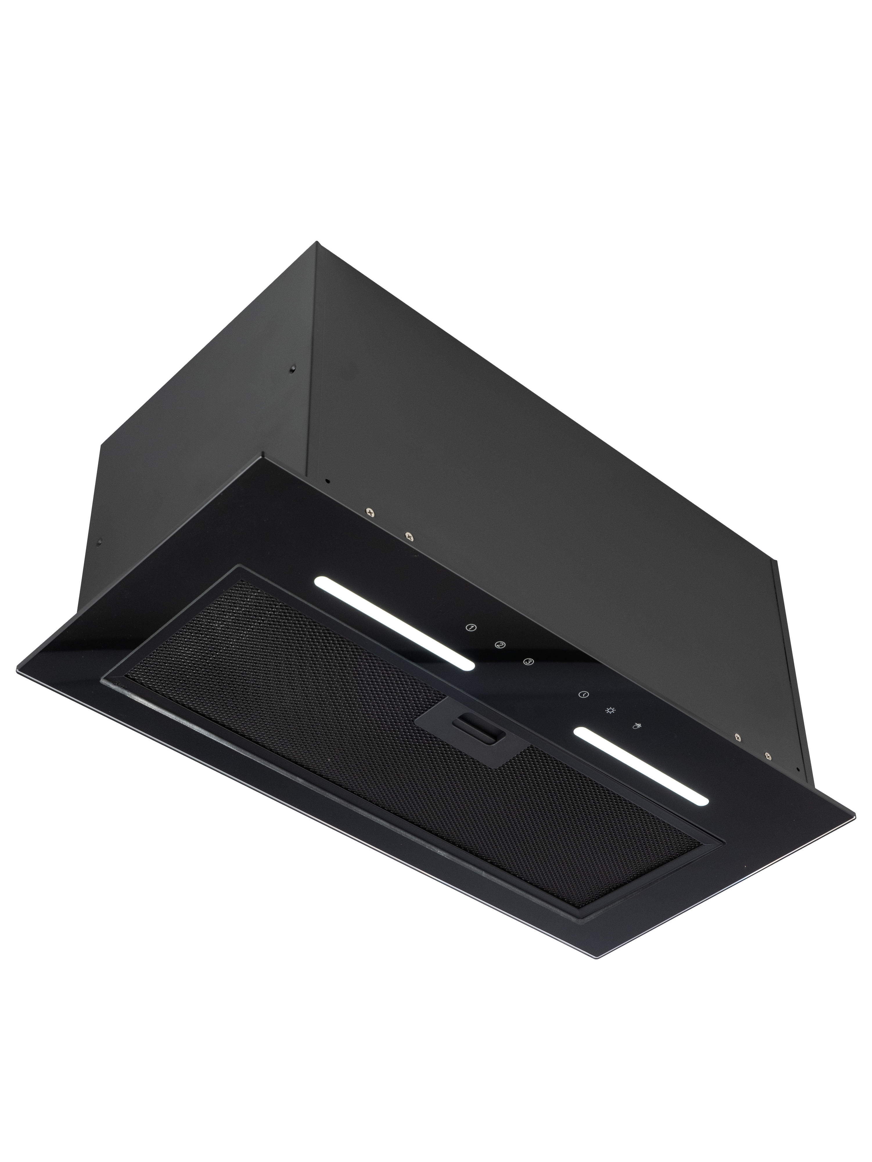 Уникальная полновстраиваемая конструкция позволяет безупречно интегрировать вытяжку в ваш кухонный интерьер, а закаленное черное стекло добавляет элегантности.