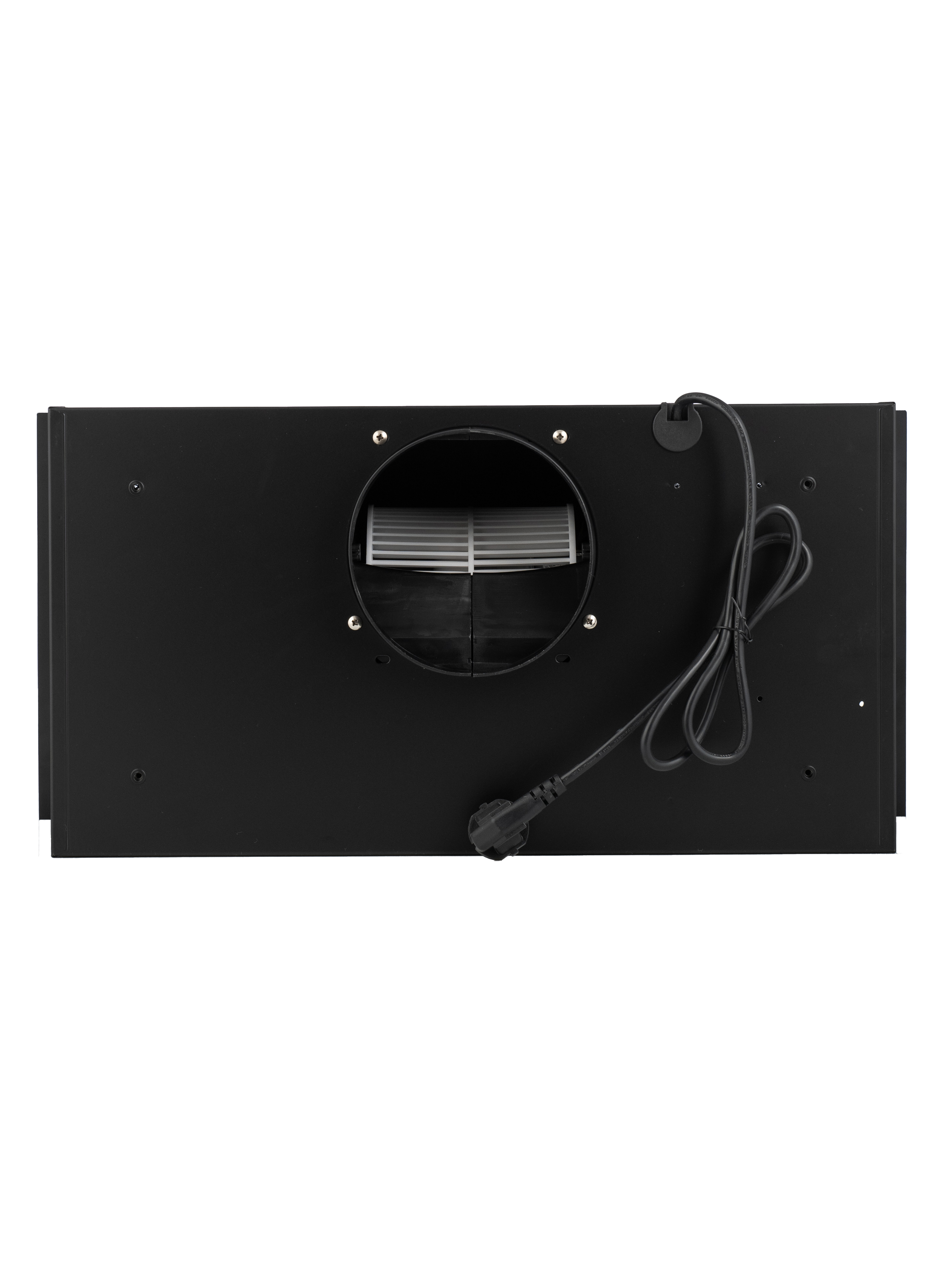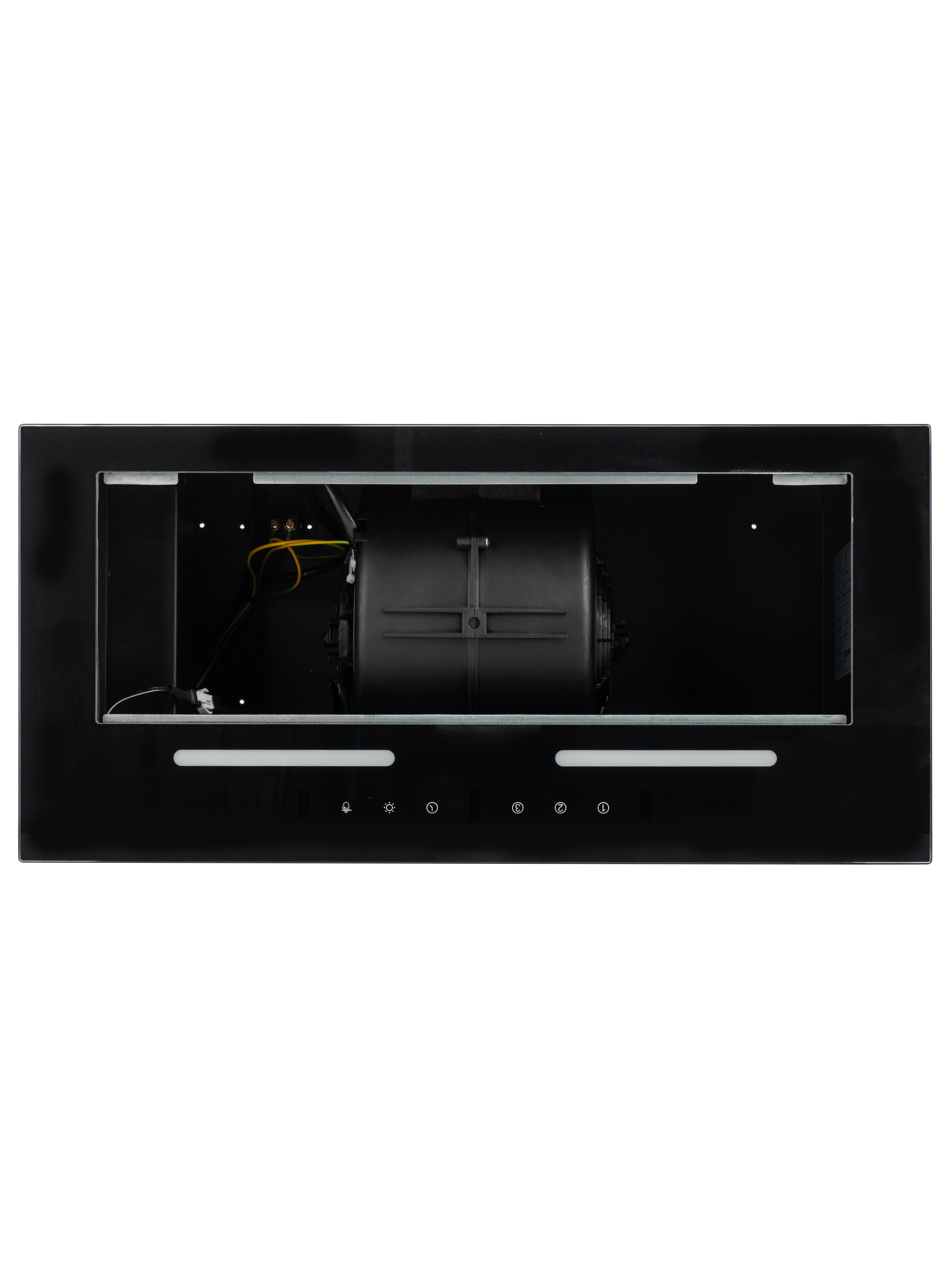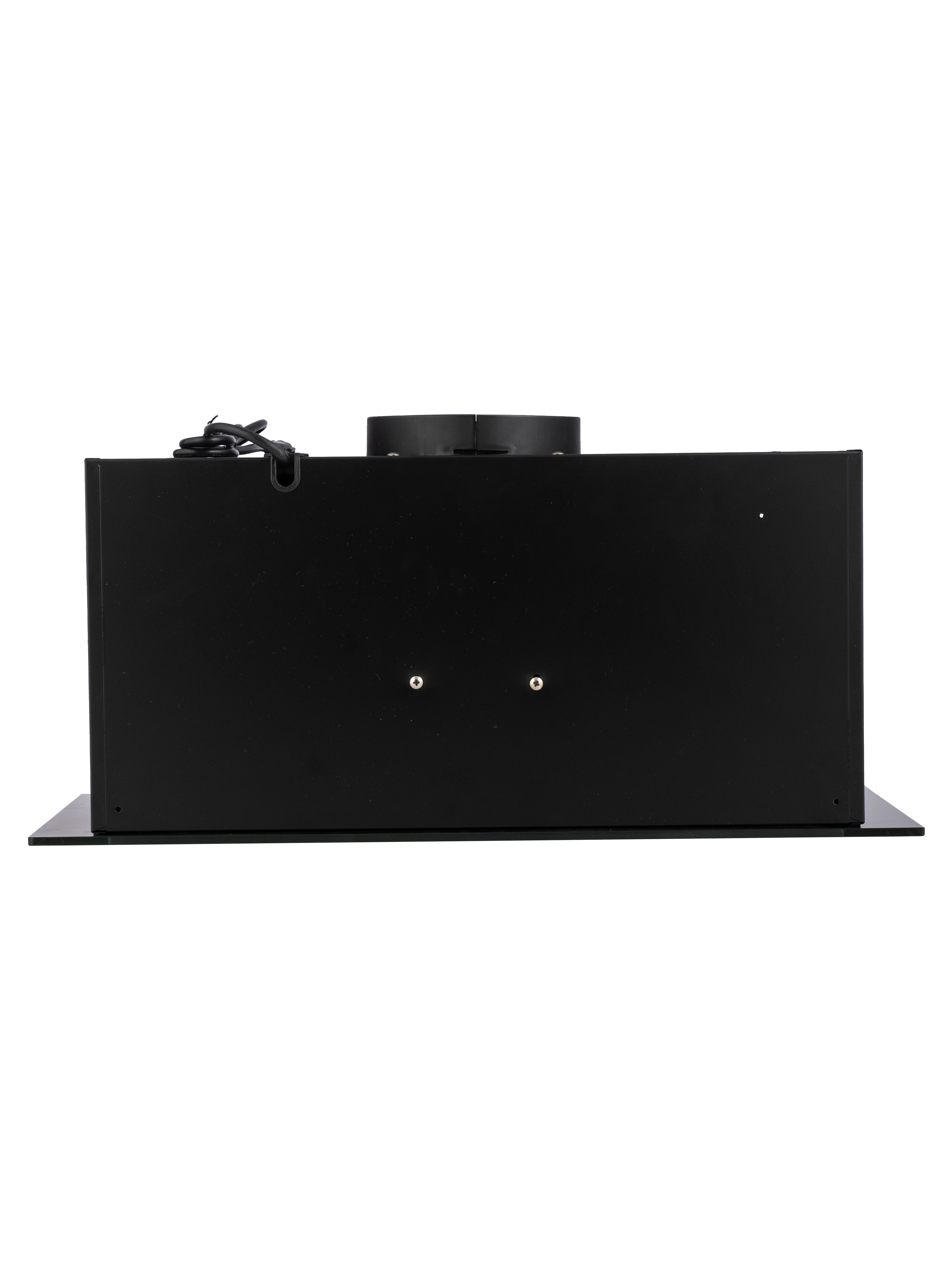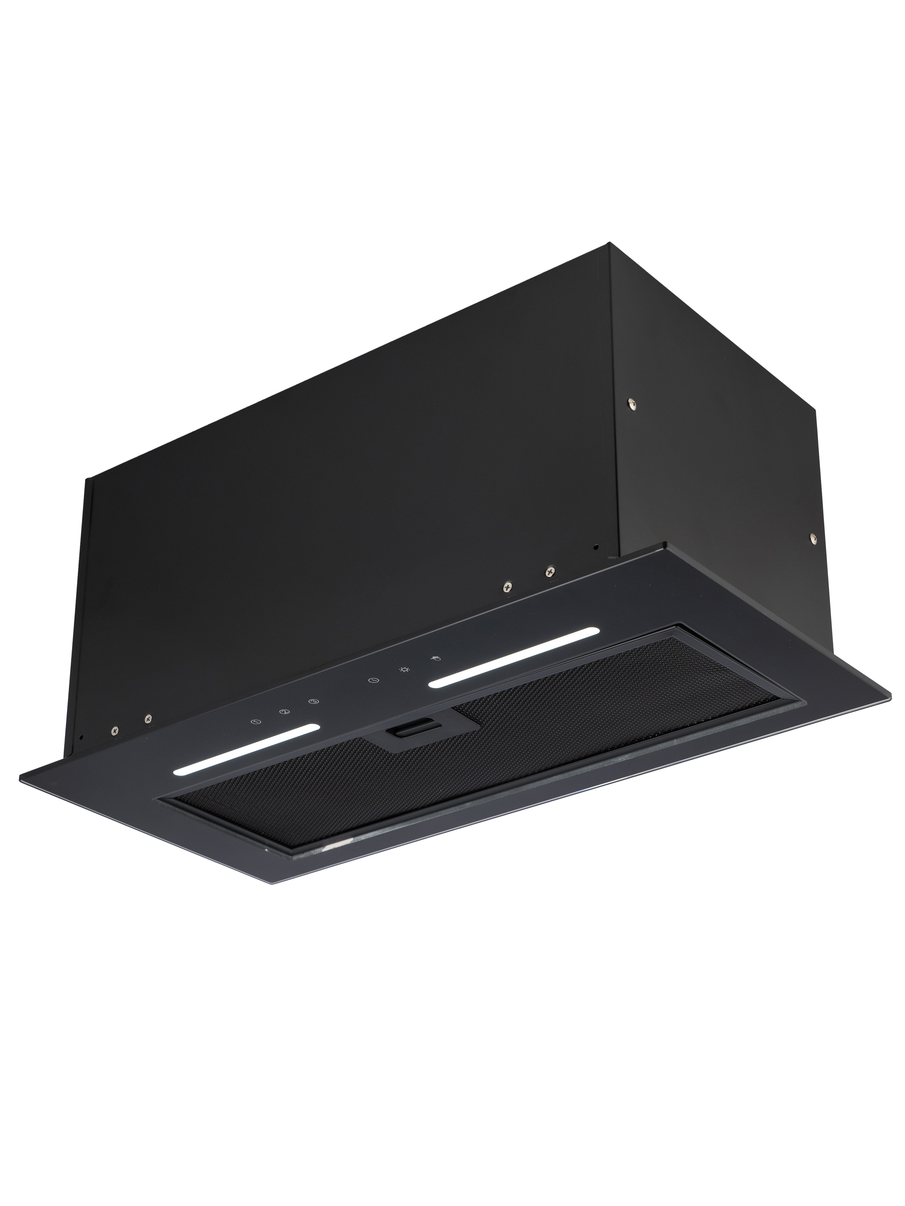 Уникальная полновстраиваемая конструкция позволяет безупречно интегрировать вытяжку в ваш кухонный интерьер, а закаленное черное стекло добавляет элегантности.