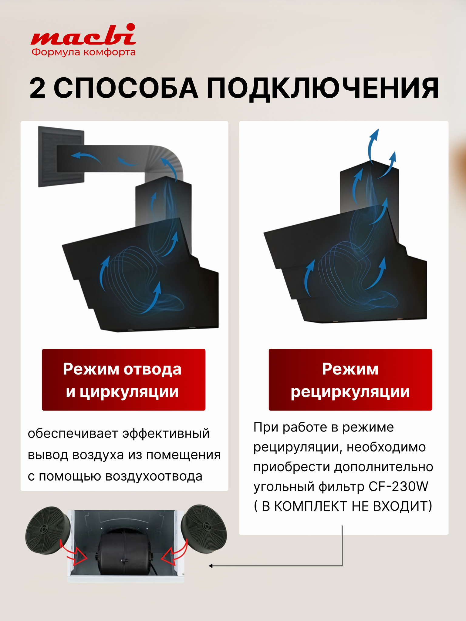 Крепится на стену над варочной поверхностью и работает в двух режимах – отвода (при подключении к системе вентиляции) и рециркуляции (при использовании сменного угольного фильтра).