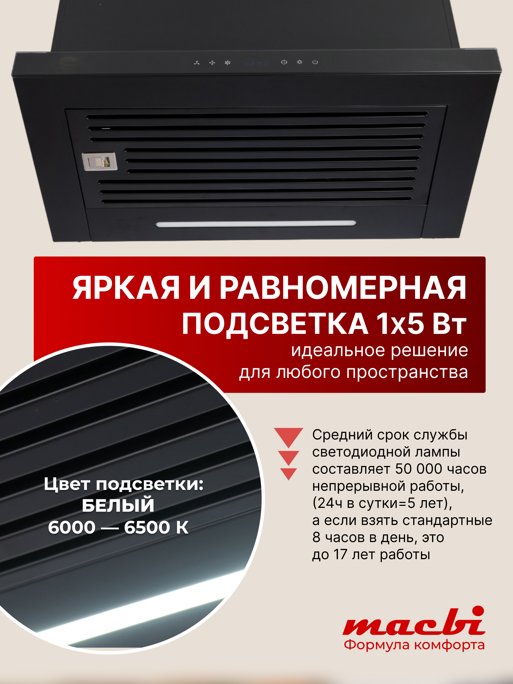 Вытяжка Perfa 60G Baf BL Macbi оснащена антивозвратным клапаном, который предотвращает обратный поток воздуха и обеспечивает безопасную эксплуатацию. Также она имеет светодиодную подсветку, которая добавляет комфорт при работе на кухне вечером или в темное время суток.