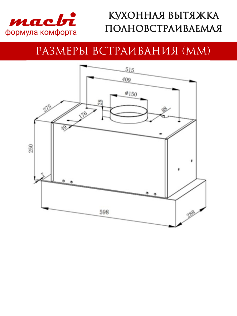 Вытяжка имеет размеры видимой части 598 мм х 288 мм и размеры для встраивания 515 мм х 275 мм. Это позволяет легко интегрировать ее в кухонный шкаф.